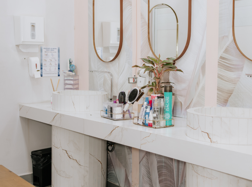 O banheiro é completo, cabine para banho, com secador, desodorante, perfume, shampoo, sabonete, absorvente, xuxinha e vários outros produtos que ajudam a mulher no dia a dia.